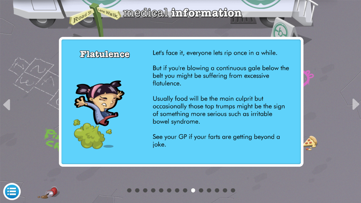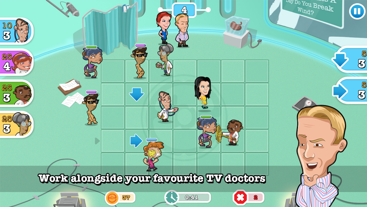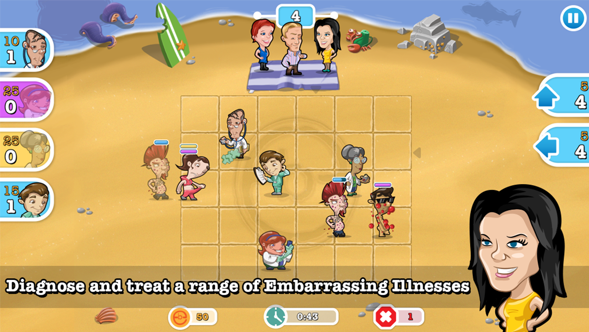 Commissioned by Maverick Television and Channel 4, Opposable Games created a light free-to-play tower defence game for mobile and web to tie in the transmission of the latest series of Embarrassing Bodies. TV doctors Christian, Pixie, and Dawn were given cartoon make-overs, and a multitude of illnesses and medical stuff were richly illustrated and animated for the game.